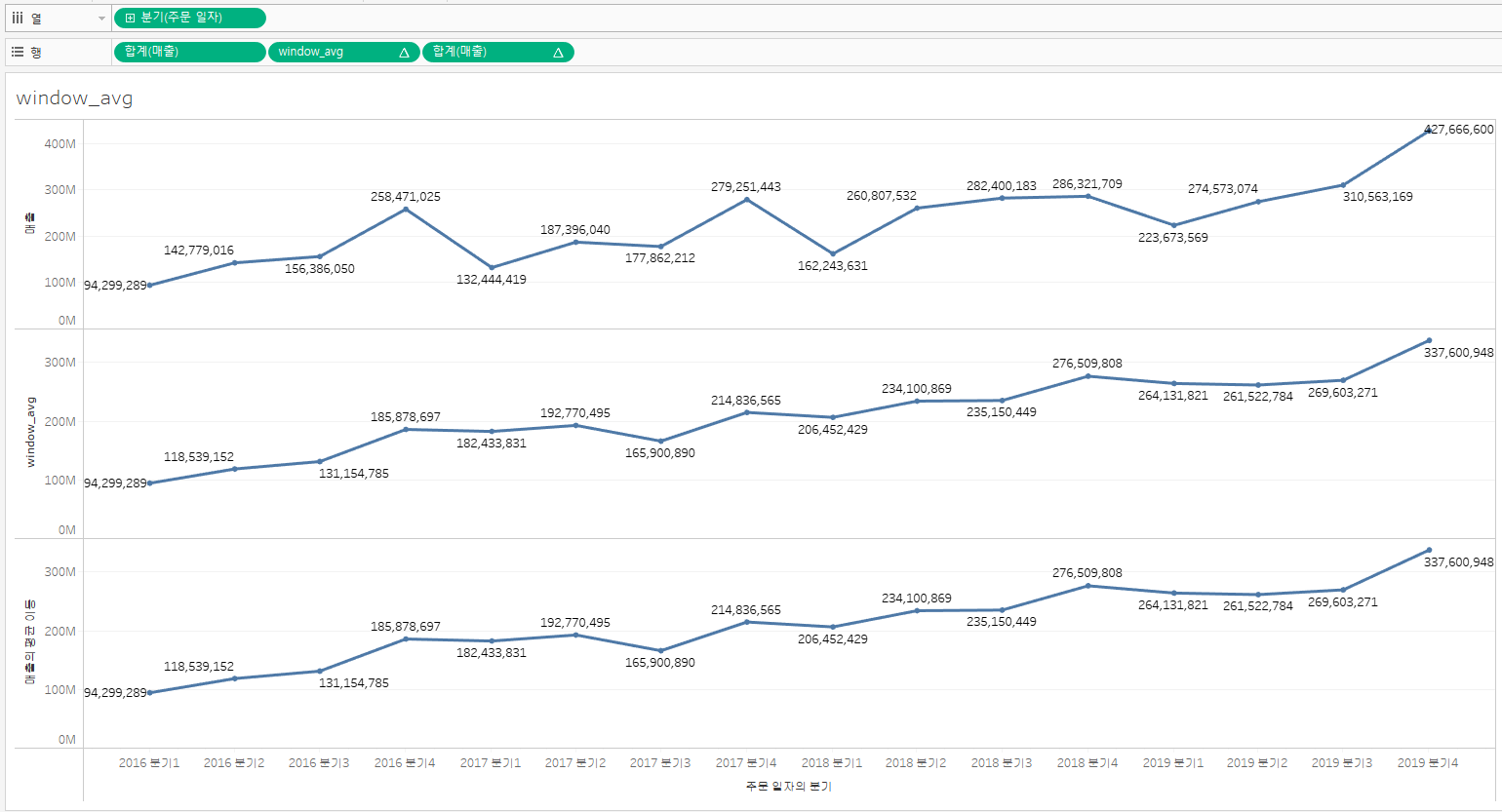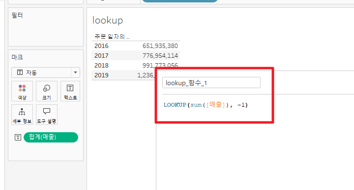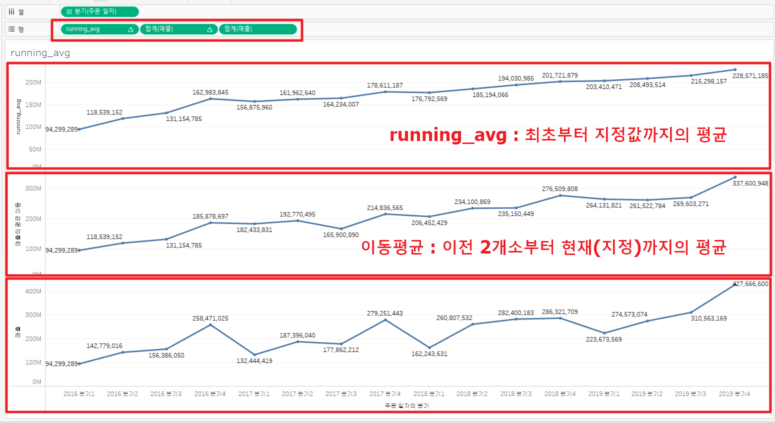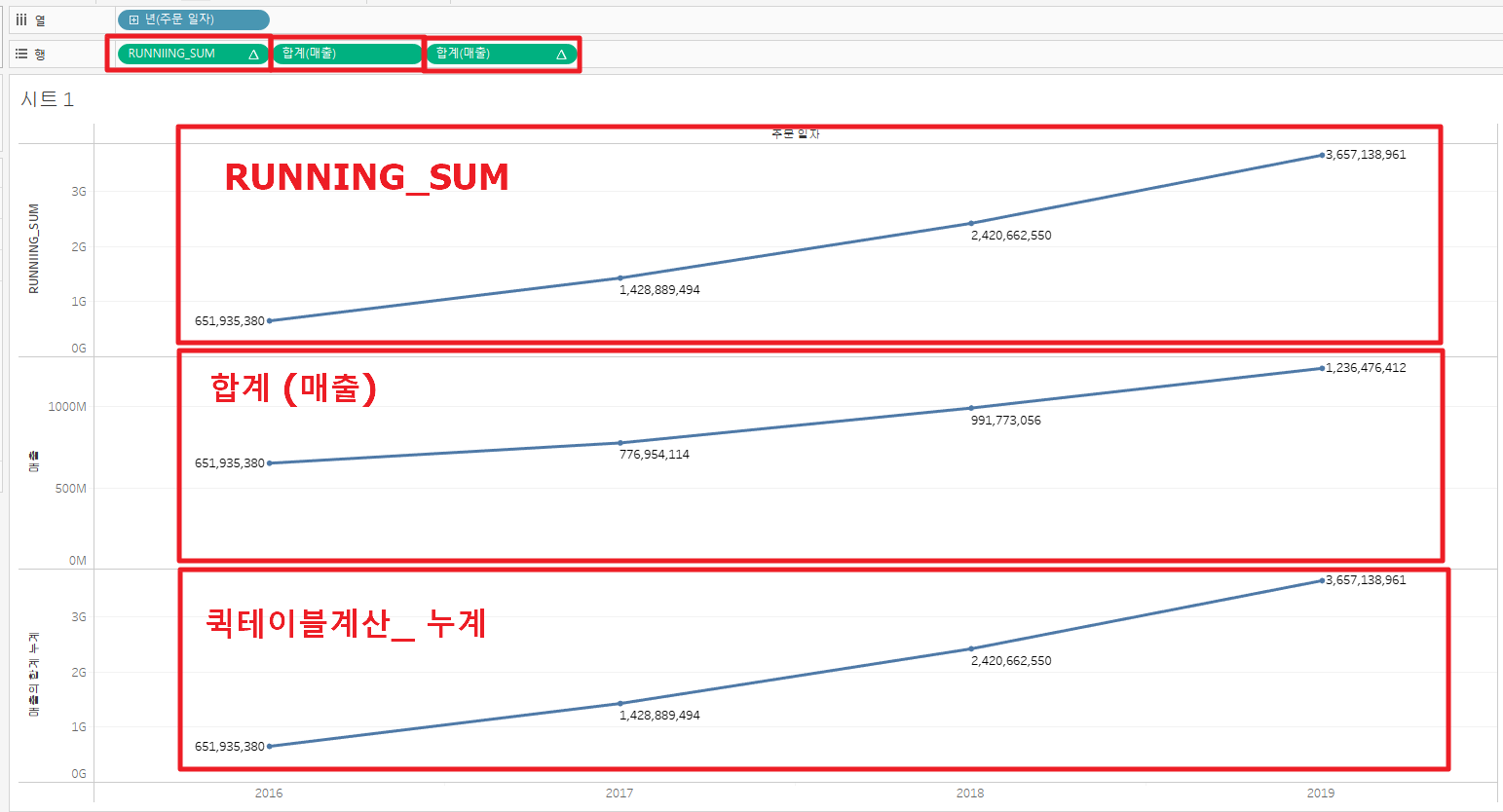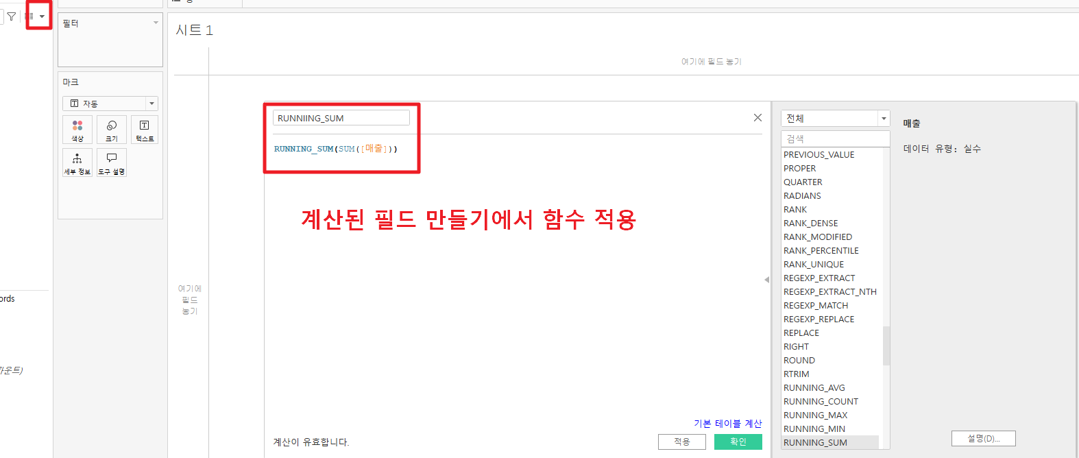 - RUNNING_SUM : 누계를 반환하는 함수, 퀵테이블의 누계 기능과 동일하다.