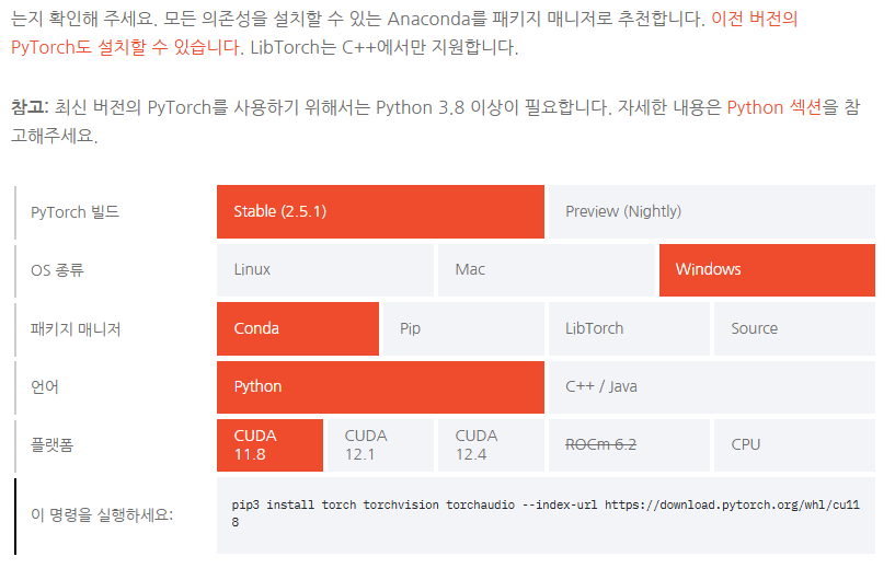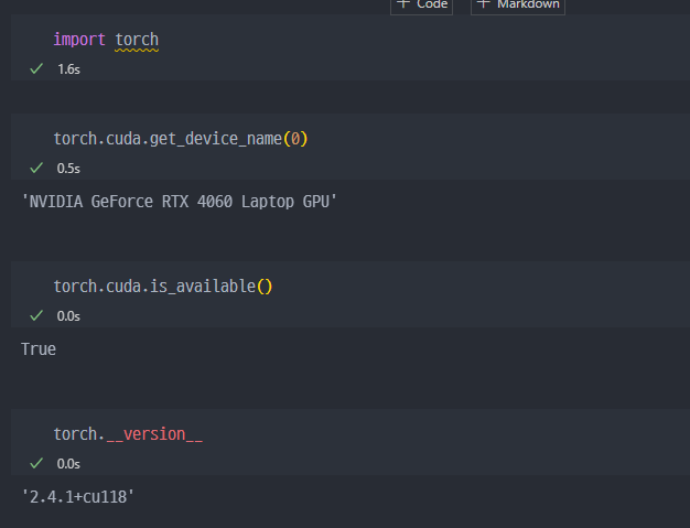 Import에 문제가 없는지, 사용하는 디바이스가 무엇인지 등 확인할 수 있다.TensorFlow와TensorFlow-GPU셋팅 이후에PyTorch를 다운로드하는데, 별달리 추가설치 없이 라이브러리, 패키지만 콘다에서 인스톨해주면 나머지는TensorFlow환경과 연동되는지 바로 사용이 된다.