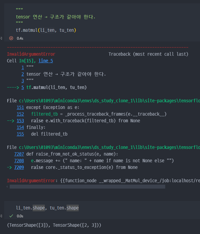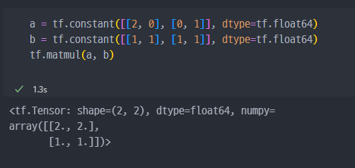 tf.matmul=행렬 곱셈(matrix multiplication)- 단, 같은 shape, 같은 dtype 에서만 적용가능하다.