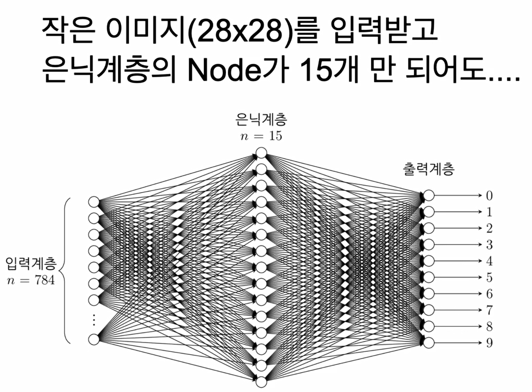 28X28 이미지로만 보아도, 엄청나게 많은 노드와 계산이 발생한다.딥러닝이 풀어야하는 과제들은 수학적으로 표현하기 힘든 것들이 많다. 이미지, 소리, 영상 등등..