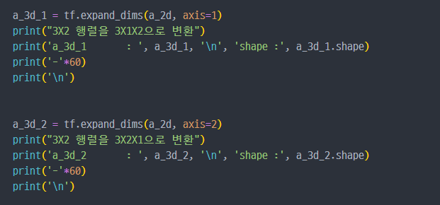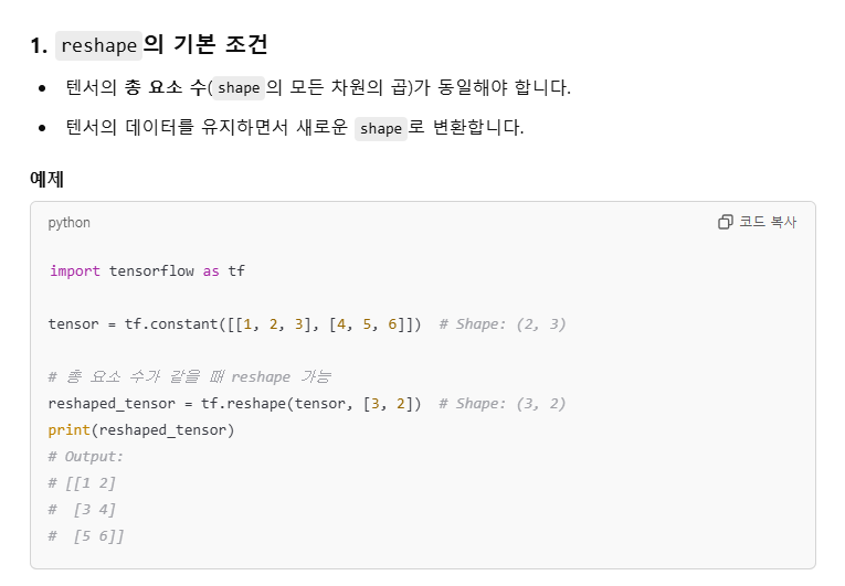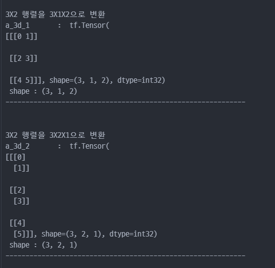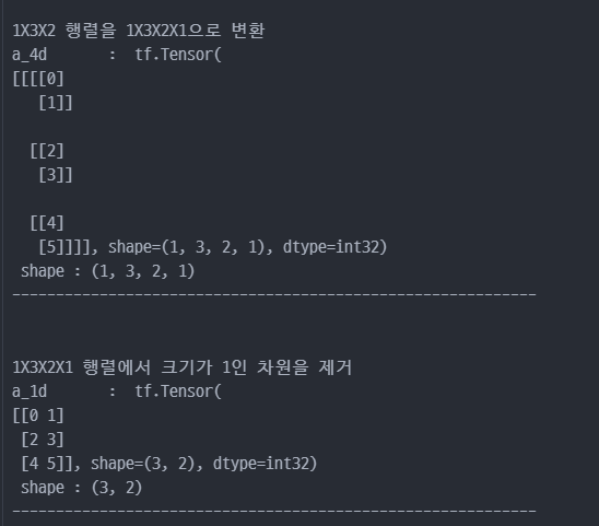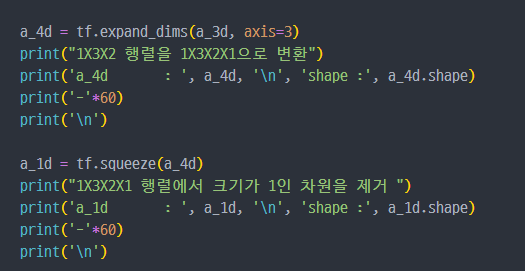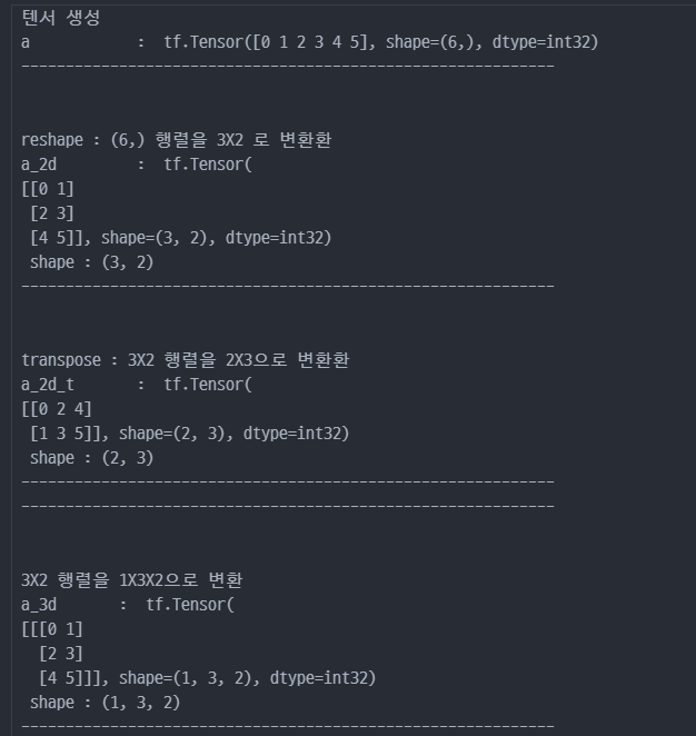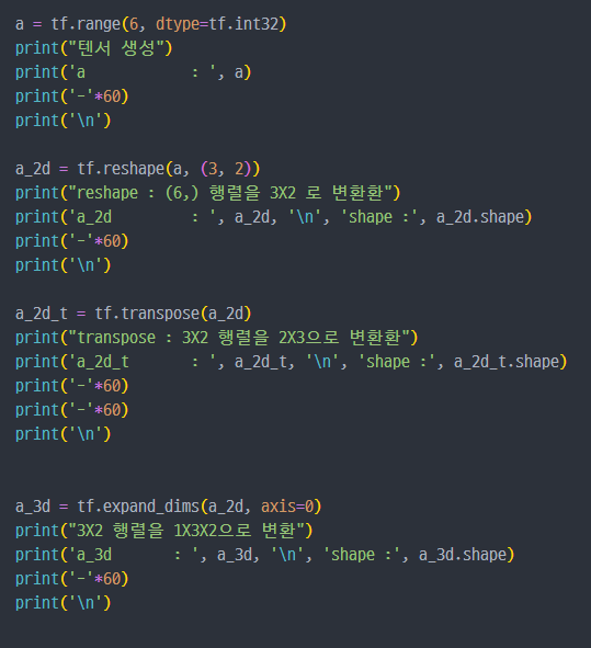 tf.reshape : 벡터 행렬의 크기 변환tf.transpose : 전치 연산tf.expand_dims : 지정한 축으로 차원을 추가tf.squeeze : 벡터로 차원을 축소