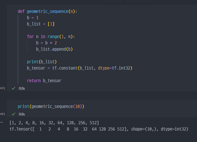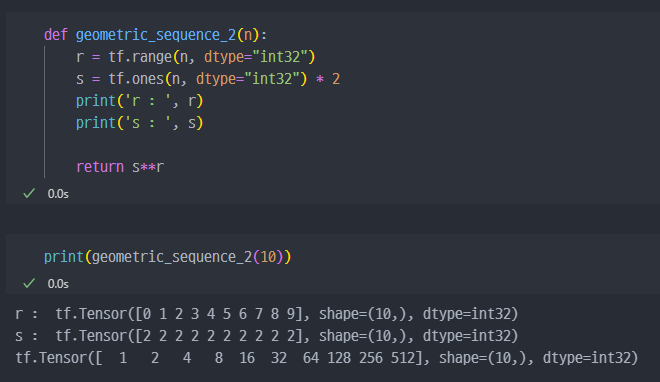n을 입력하면 첫 항이 1이고 공비가 2인 등비수열을 생성하는 함수를 만드시오. ( 이 때 결과값은 tf.Tensor 데이터이고, 데이터 타입은 tf.int32 )