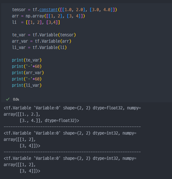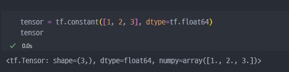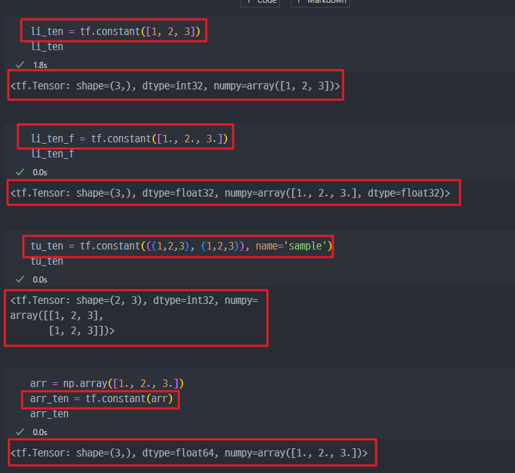 Tensor를 다루는 도구이다.Tensor를 다룰때 가장 중요한 것!! → SHAPE!!!tf.Tensor 데이터!!tf.constant()list → Tensortuple → TensorArray → Tensor숫자(상수)를 어떻게 생성하냐?? → 리스트, 튜플, Array로 생성하고