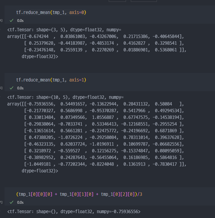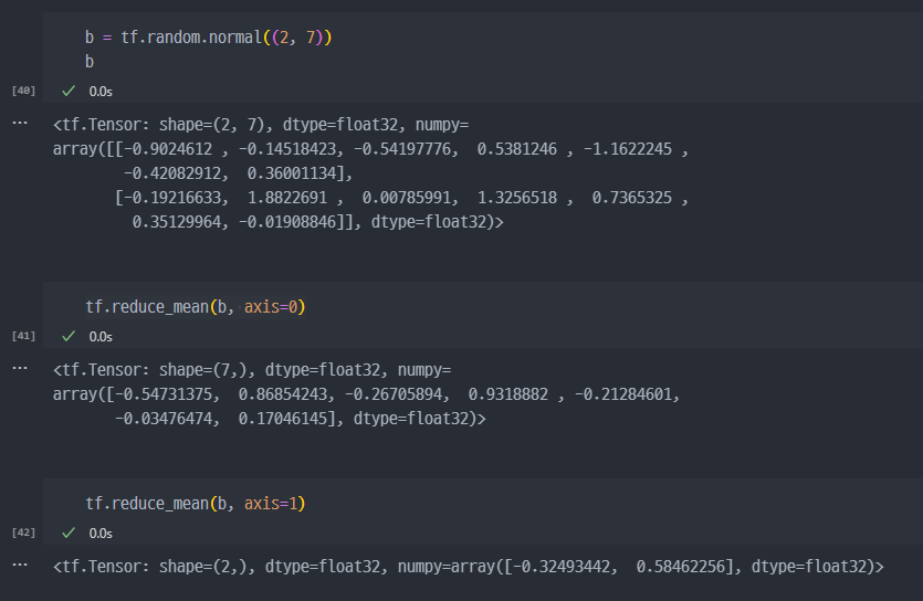 tf.reduce_mean : 설정한 축(axis)의 평균을 구한다.tf.reduce_max : 설정한 축(axis)의 최댓값을 구한다.tf.reduce_min : 설정한 축(axis)의 최솟값을 구한다.tf.reduce_prod : 설정한 축(axis)의 요소를 모두 곱한 값을 구한다.tf.reduce_sum : 설정한 축(axis)의 요소를 모두 더한 값을 구한다.기초사용법