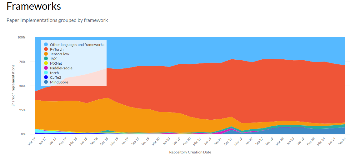 PyTorch가 연구,논문분야에서는 압도적으로 많이 사용된다.- 단, 앱, 웹 등 실용/산업분야에서는 아직