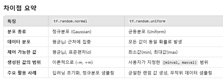 tf.random 이 구현되어 있음.tf.random.normal : 정규분포 중에서 랜덤하게 상수 반환tf.random.uniform : 균등분포 중에서 랜덤하게 상수 반환