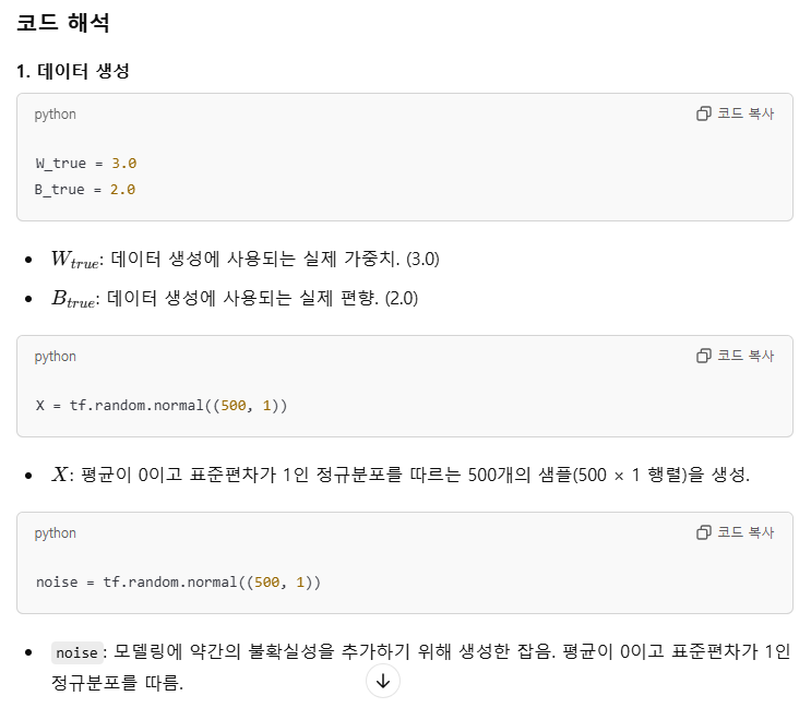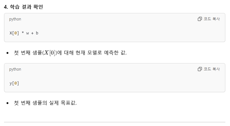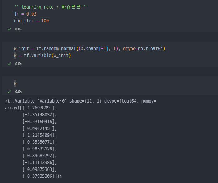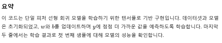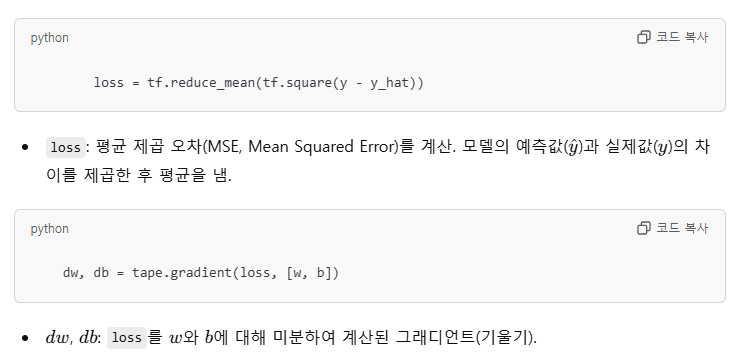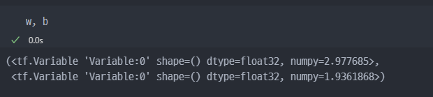 w, b 값은 각각 5.0 과 0.0으로 셋팅하였다.learning_rate는 0.03를 부과하였다. 모델이 매 학습 단계에서 w와 b를 얼마나 빠르게 업데이트할지 결정하는 학습률.