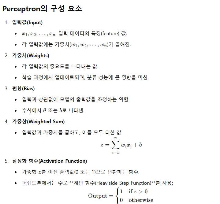 Perceptron은 Frank Rosenblatt가 1958년에 제안한 가장 기본적인 형태의 인공신경망 모델로, 머신러닝과 딥러닝의 기본이 되는 개념입니다. Perceptron은 단층 신경망(Single-Layer Neural Network)의 한 종류로 볼 수 있으며, 이진 분류 문제를 해결하기 위해 설계되었습니다.