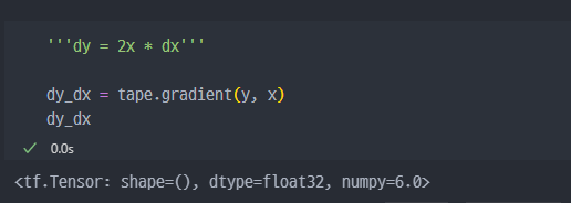 y = x**2이다. x는 3이므로 y는 9이다. 미분하게 되면x**2의 식이2x로 변경되며, x는 3 이므로 미분값(리턴값)은6이 된다.