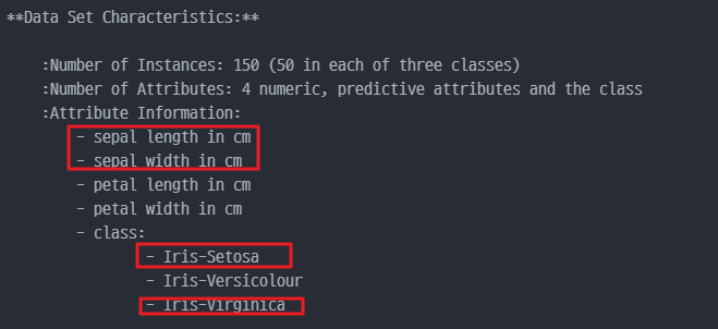 데이터 정리, Sepal에 대한 특성값 그리고 Setosa, Virginica에 대한 값들만 추출해서 정리해야 한다.