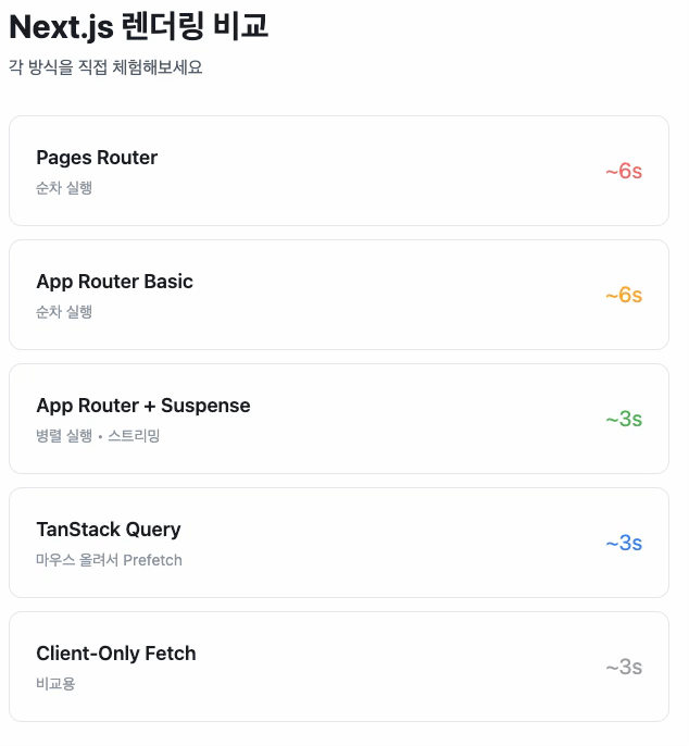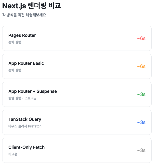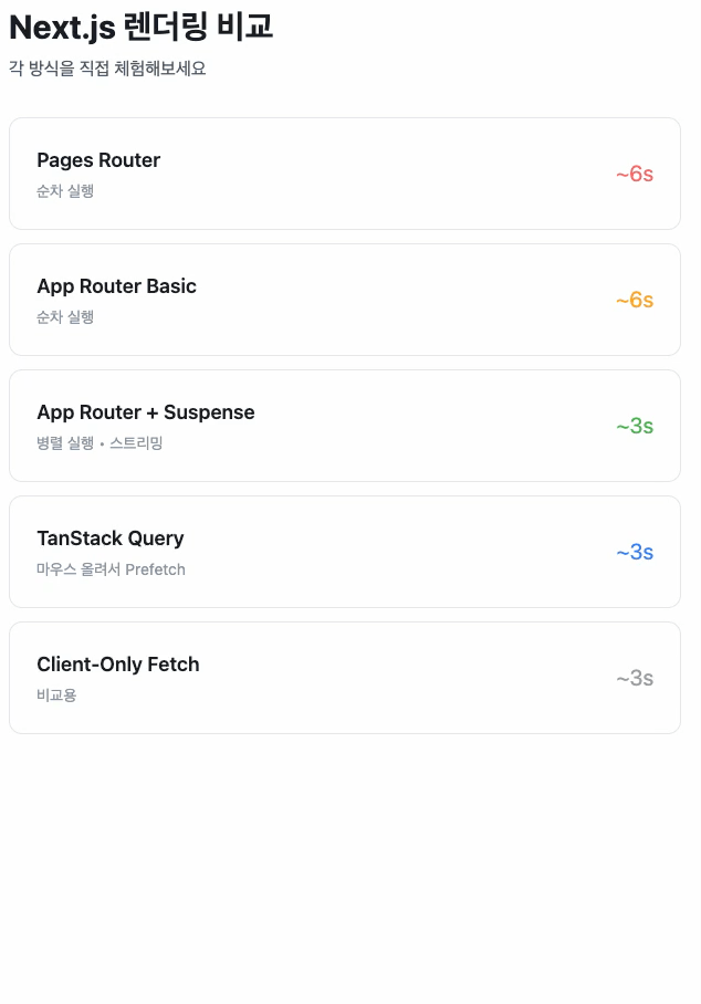 궁금증이 생겨 직접 Pages Router, App Router, Suspense, TanStack Query, Client Fetch 방식들을 비교 테스트했고,
