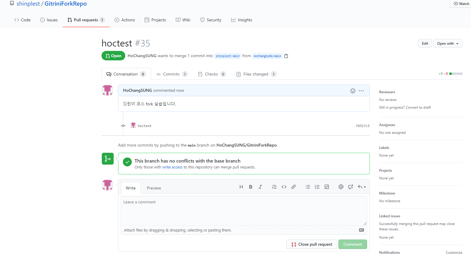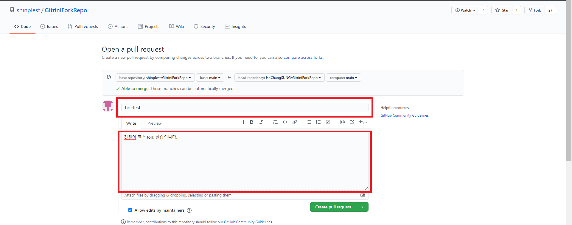 제목과 comment 작성 후 create pull request 버튼 클릭