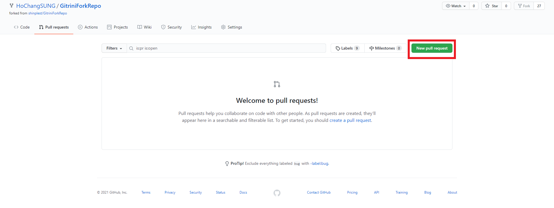 내 깃헙 레포지토리에서 해당 레포지토리의 new pull request 버튼 클릭
