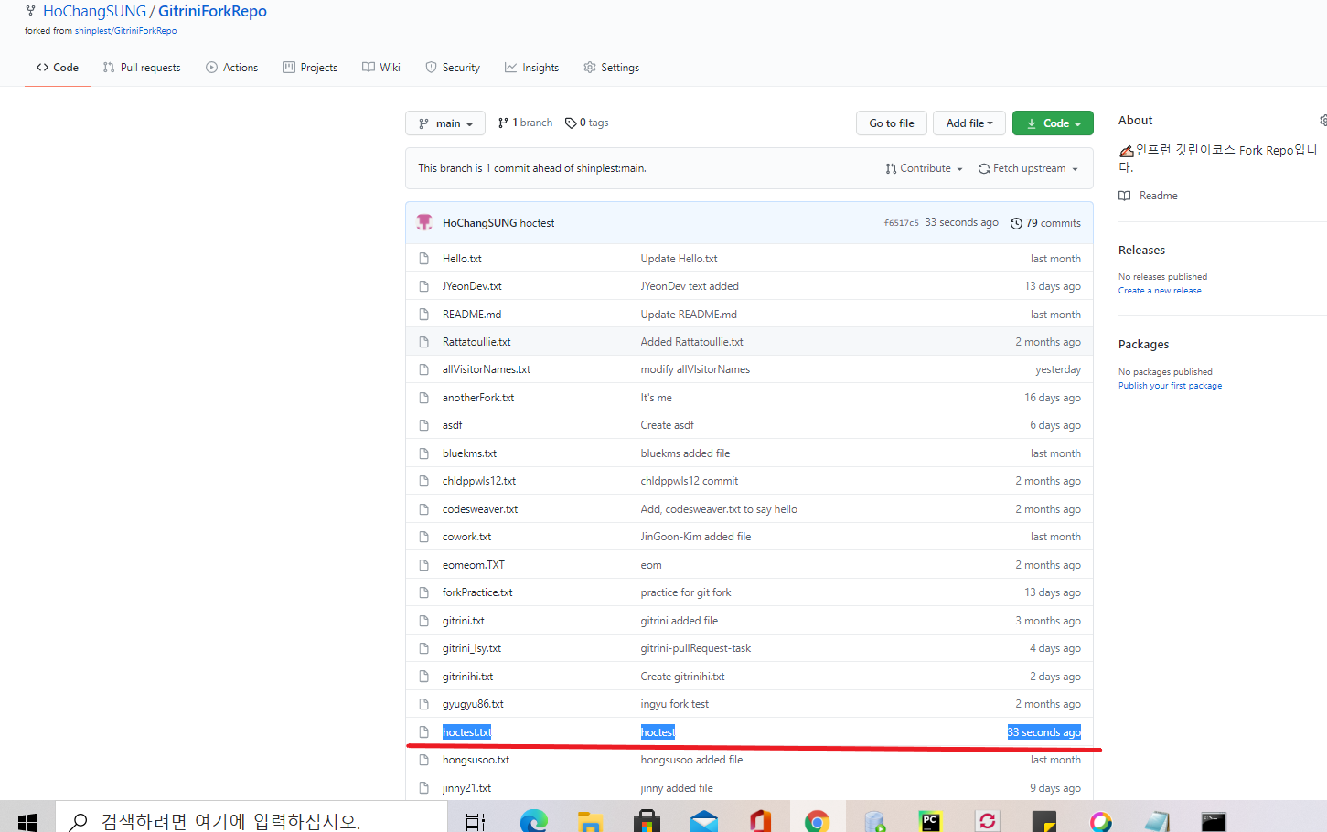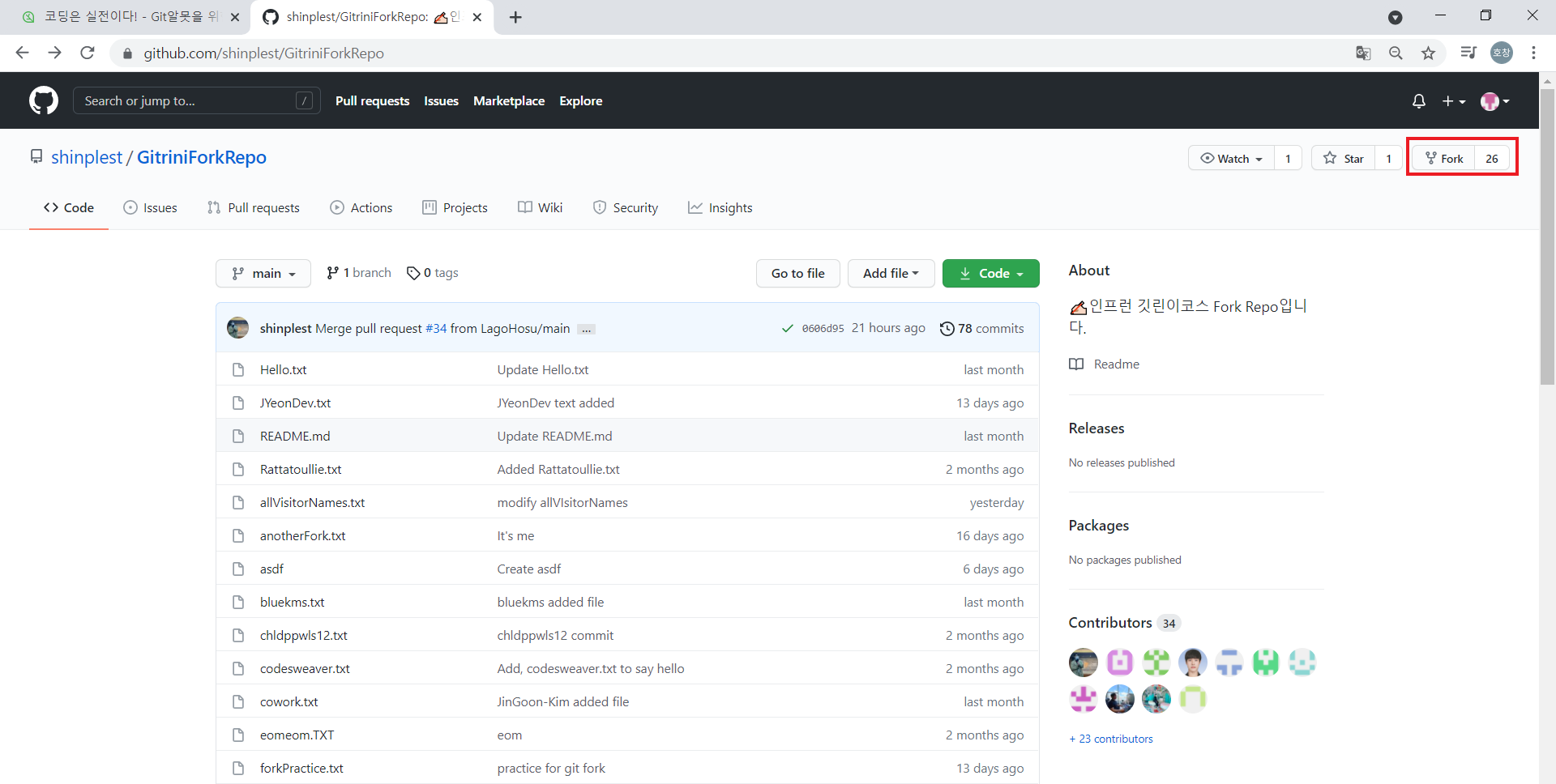 내 깃헙 레포지토리에 fork한 레포지토리가 있는 것 확인 가능