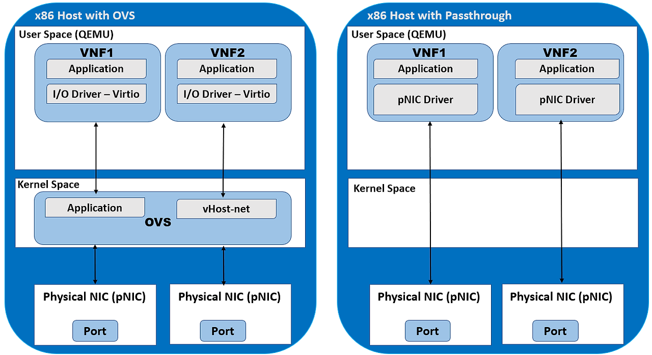 PCI passthrough는 VNF가 물리 PCI장치에 직접 접근할 수 있도록 하며, 마치 해당 장치가 VNF에 물리적으로 연결된 것처럼 동작하게 함. PCI passthrough를 사용하면 물리 네트워크 인터페이스 카드를 단일 VNF에 매핑하여 VNF가 물리 인터페이스에 직접 연결된 것처럼 보이게할 수 있음.