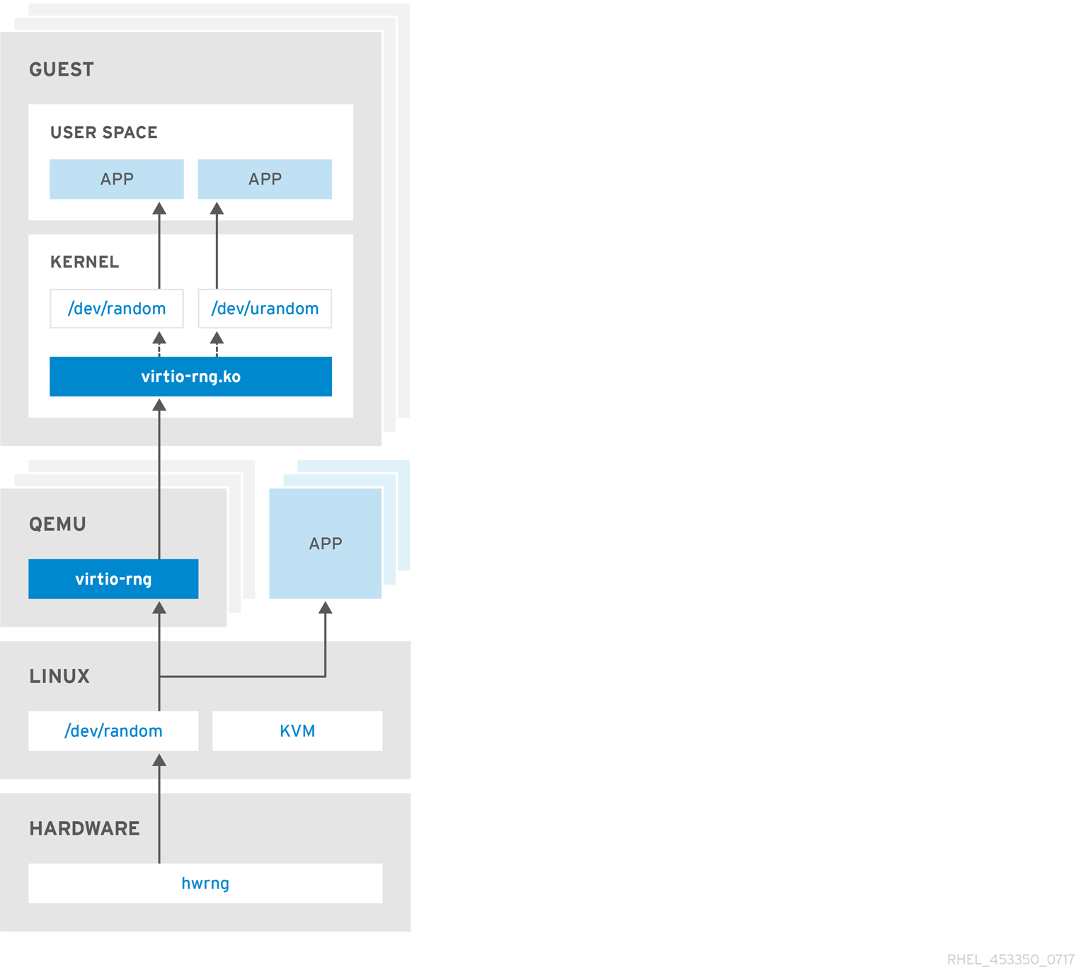 - Red Hat Enterprise Linux 7에서는 KVM 가상 시스템이 호스트의 엔트로피에 접근할 수 있도록 virtio RNG(Random Number Generator) 를 도입.