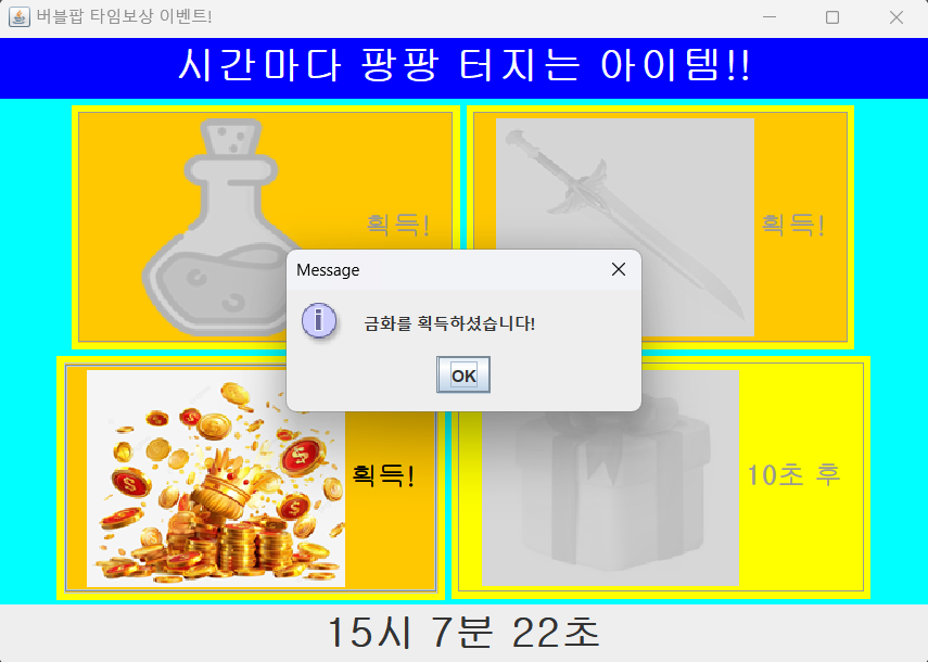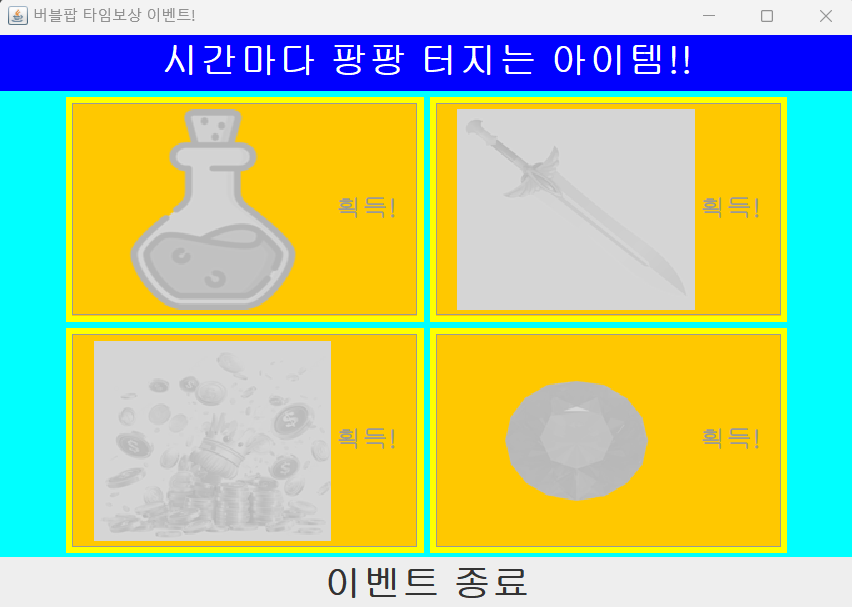 JLabel titleL = new JLabel("시간마다 팡팡 터지는 아이템!!");