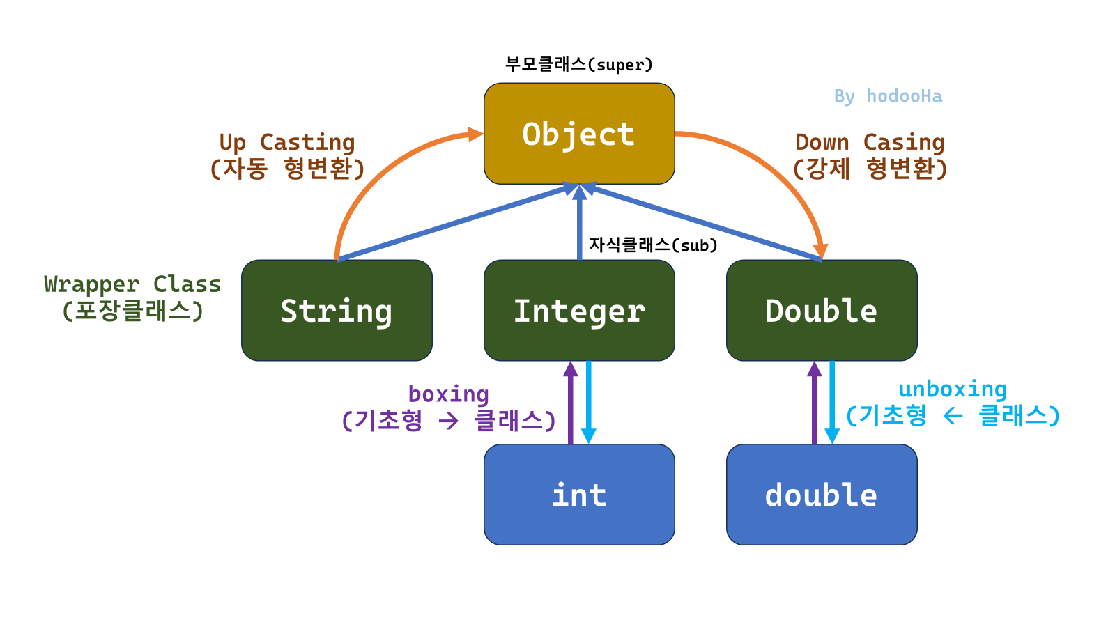 기본 타입의 값을 갖는 객체를 포장(Wrapper) 객체라고 한다. 기본 타입의 값을 포장 객체로 만드는 것을 박싱(Boxing)이라고 하고, 반대로 포장 객체로부터 기본 타입의 값을 얻는 것을 언박싱(Ubboxing)이라고 한다.