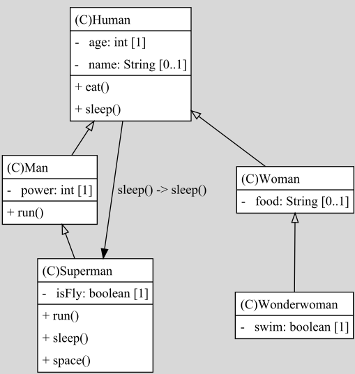 또 Superman은 Man클래스의 자식 클래스, Woman은 Wonderwoman클래스의 부모 클래스이다.