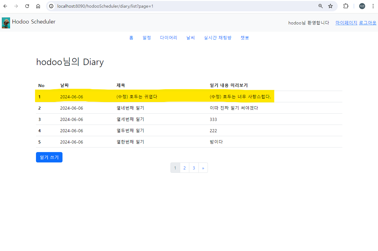 제목과 일기 내용에 (수정)이라고 추가하였다.