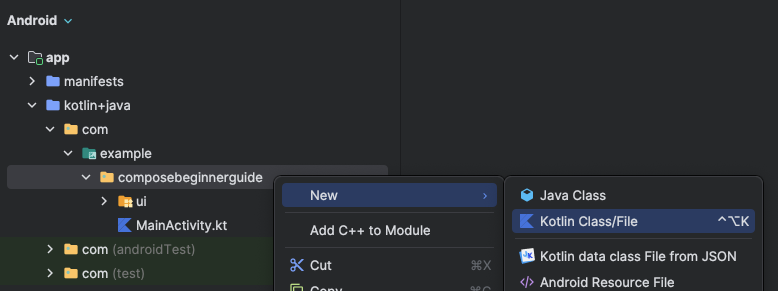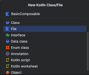 ComposeBeginnerGuide로 작성했기 때문에, composebeginnerguide라는 이름의 폴더를 선택하게 됩니다.이후, 아래의 여러 옵션 중에 “File”을 클릭하고 “BasicComposable”이라는 이름을 작성한 후 엔터를 누르면 BasicComposable.kt이라는 이름의 파일이 생성됩니다.