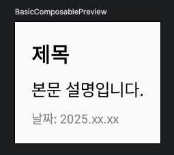 Column을 사용하면 각 요소를 위에서 아래로 나열할 수 있습니다.verticalArrangement에 Arrangement.spacedBy(8.dp) 같은 값을 사용하면 요소 간의 간격을 쉽게 조절할 수 있습니다.fontSize, fontWeight, color 등의 속성을 직접 지정하여, 원하는 텍스트 스타일을 간단하게 표현할 수 있습니다.📌 학습 포인트