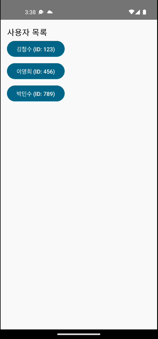 실제 앱에서는 화면 이동 시 데이터를 함께 전달해야 하는 경우가 많습니다. 예를 들어 사용자 목록에서 특정 사용자를 선택했을 때, 그 사용자의 ID나 정보를 상세 화면으로 전달해야 합니다.