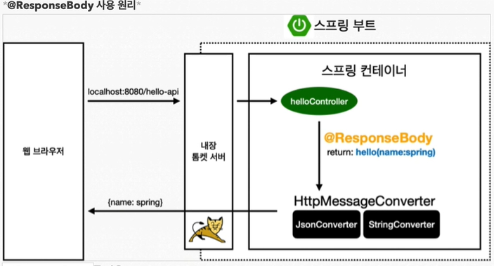 @GetMapping("hello-string") @ResponseBody // http 통신 프로토콜 규칙에 의해 body에 직접 데이터를 넣겠다. public String helloString(@RequestParam("name") String name){ return "hello " + name; // hello spring }객체를 넘길때(JSON)