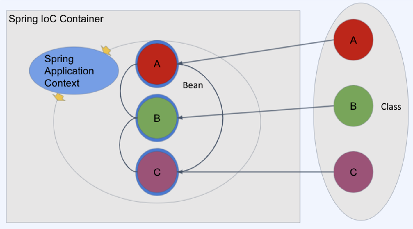 사용자가 만든 클래스를 Bean으로 등록하겠다고 하면 스프링 컨테이너 안에 등록이 되고 Spring Application Context안에 Bean이 등록이 되고 우리가 만든 클래스를 실체 인스턴스로 스프링에서는 단일 객체로 인스턴스화를 시켜준다.