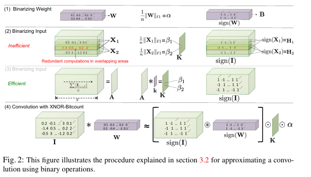 여기서 ⊛는 XNOR 및 비트 카운팅 연산을 사용한 합성곱을 나타내며, K는 입력의 모든 하위 텐서에 대한 스케일링 팩터를 포함하는 행렬입니다. 이를 통해 합성곱 연산을 주로 이진 연산으로 수행하여 계산 효율성을 크게 향상시킬 수 있습니다.