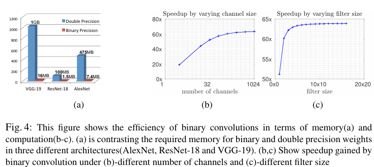 이진 가중치를 사용하면 32비트 실수 대신 1비트로 가중치를 저장할 수 있어 메모리 요구량을 32배 줄일 수 있습니다. 그림 4-a는 AlexNet, VGG-19, ResNet-18에서 이진 가중치와 실수 가중치에 필요한 메모리를 비교한 결과를 보여줍니다. 이진 가중치 네트워크는 크기가 매우 작아 휴대용 기기에 쉽게 탑재될 수 있습니다.
