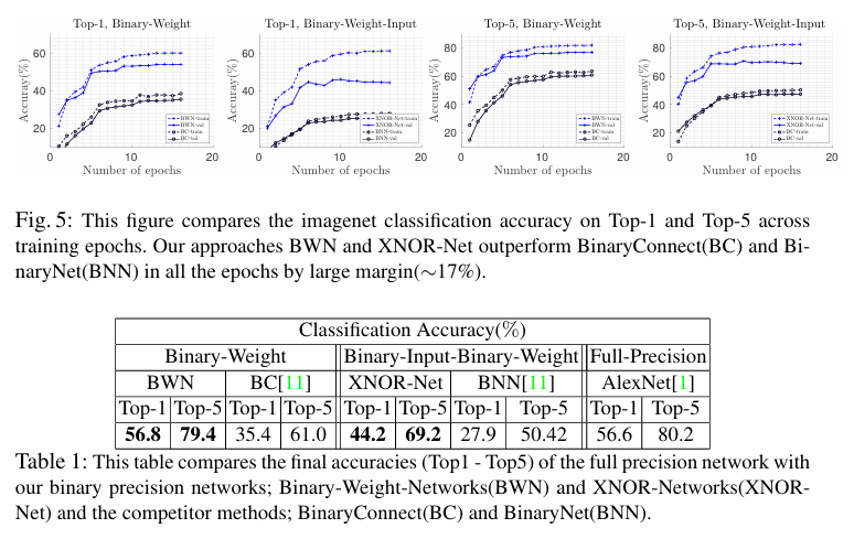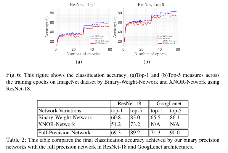GoogLenet 변형 아키텍처에서는 BWN이 65.5% top-1, 86.1% top-5 정확도를 달성했으며, 전체 정밀도 네트워크의 정확도는 71.3% top-1, 90.0% top-5였습니다.