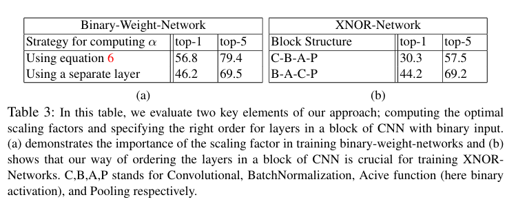 결과적으로, 방정식 6을 사용한 방법이 top-1 정확도 56.8%, top-5 정확도 79.4%를 달성한 반면, 별도 레이어를 사용한 방법은 top-1 정확도 46.2%, top-5 정확도 69.5%로 성능이 저하되었습니다. 이는 최적의 스케일링 팩터를 계산하는 방법이 이진 네트워크의 성능에 중요함을 보여줍니다.