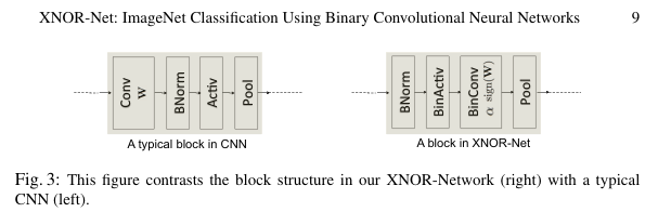 저자들은 이를 해결하기 위해 블록 구조를 변경하여, 먼저 배치 정규화를 적용한 후 이진 활성화, 그 다음 이진 합성곱, 마지막으로 풀링을 적용하는 순서를 제안합니다. 이렇게 하면 이진화로 인한 정보 손실을 최소화할 수 있습니다.