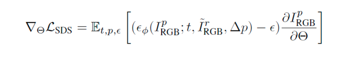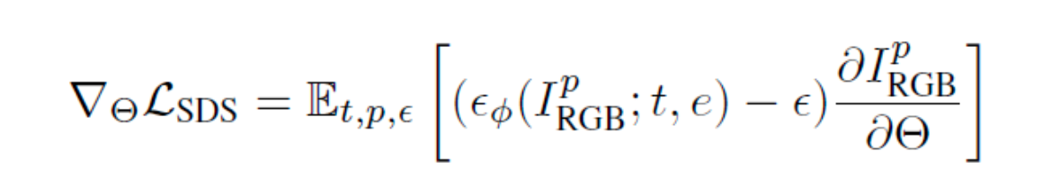 Text-to-3D에서는 text만 input으로 사용되고 StableDiffusion이 사용된다. SDS Loss는 다음과 같이 계산된다.