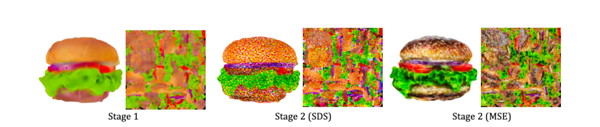 이 단계에서는 앞선 coarse texture를 refine합니다. 그 과정에서 SDS Loss를 바로 사용하면 위 그림처럼 artifacts가 발생합니다. 이는 rasterize할 때 mipmap(여러 해상도의 이미지들) texture sampling 기법 때문이라고 합니다. mipmap(서로 다른 해상도의 이미지들)으로 전파되는 graident들이 과도한 채도(saturation) block들을 만들기 때문입니다. 그래서 blurry한 texture를 fine-tune하기 위한 방법을 제시하고 있습니다.