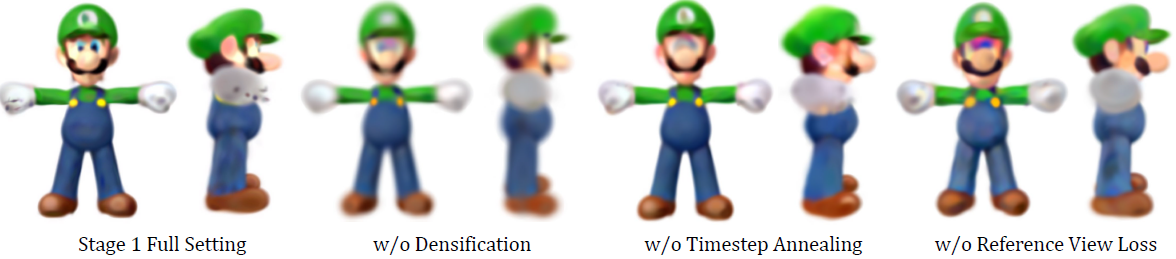 여기서 는 에서 random noise이고, 는 image-to-3D에서는 이고 text-to-3D에서는 입니다. 시작 timestep 는 noise strength를 제한하기 위해 조심스럽게 선택된다고 합니다. 그 결과 original content를 파괴하지 않으면서 detail들을 강화할 수 있다고 합니다.
