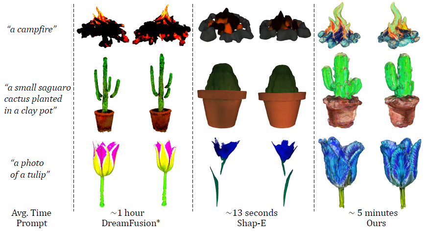 최적화 기반 2D 리프팅 방법(Optimization-based 2D lifting method): 2D 확산 모델을 사용하여 3D 모델을 최적화하는 방식으로, 현실감 있고 다양한 모델을 생성할 수 있지만, 생성 시간에 많은 시간이 소요됩니다.