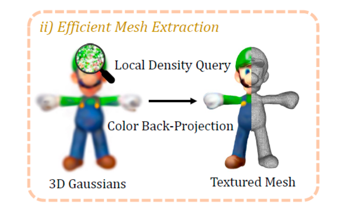 3D Gaussian들을 mesh로 변환한 최초의 시도라고 표현하고 있습니다. 3D Gaussian Splatting 논문에선 이미지 plane으로 projection하는 것은 소개되었지만, 3D mesh로 projection은 언급되어있지 않습니다. Local Density Query와 Color Back-projection 기법을 통해 Mesh Extraction하는 방법을 소개하고 있습니다.