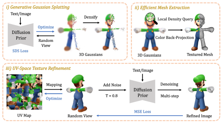 이렇게 3D Gaussian Splatting 으로만 모델링 할 경우, 상당히 blurry한 것을 볼 수 있습니다. 각 optimization step이 inconsistent 3D guidance를 제공하기 때문에, under-reconstruction 지역을 정확하게 densification하거나 over-reconstruction을 pruning하는 것에 어려움을 겪습니다. 그래서 이러한 관측을 통해 mesh extraction과 texture refinement 디자인을 도입하게 됩니다.