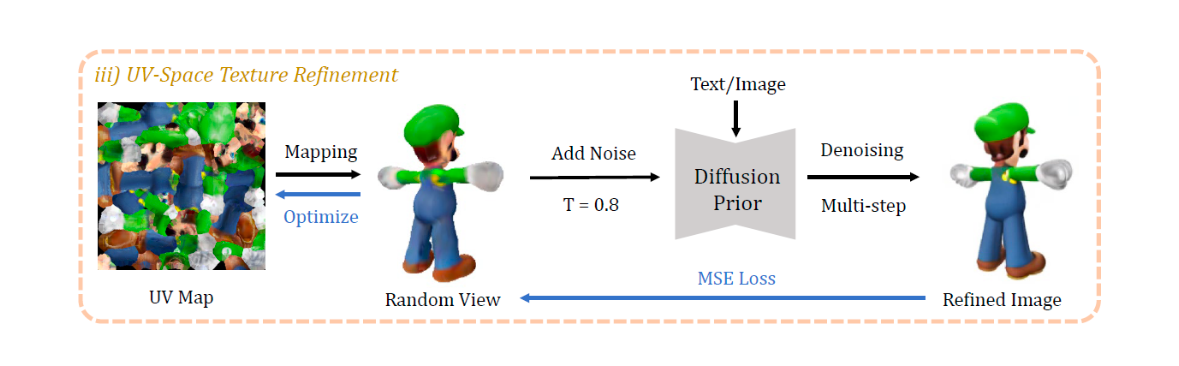 정리하자면, coarse한 이미지를 2D diffusion prior의 denoising process를 통해 refine한 이미지로 생성하고, refined된 이미지로 만들 수 있도록 Textured Mesh의 UV Map을 pixel단위로 업데이트 하는 것이러고 할 수 있겠습니다.