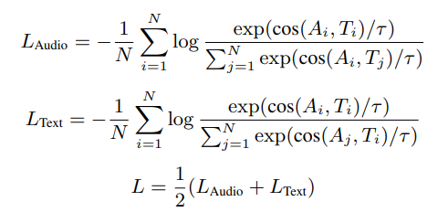 여기서 와 는 각각 Audio 임베딩과 Text 임베딩을 나타내며, cos( · , · )는 코사인 유사도를 의미하고, 는 온도 파라미터입니다.
