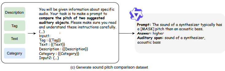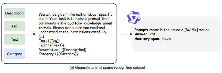 • 청각 지식 스팬 감지 → CLAP으로 관련 오디오 검색 → 오디오 임베딩 생성 → 언어 모델에 주입