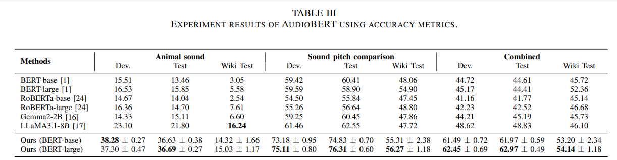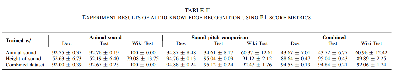 위의 표와 같이 Animal sound recognition(동물 소리 인식), Sound pitch comparison(소리 음높이 비교)에서 모두 준수한 성능