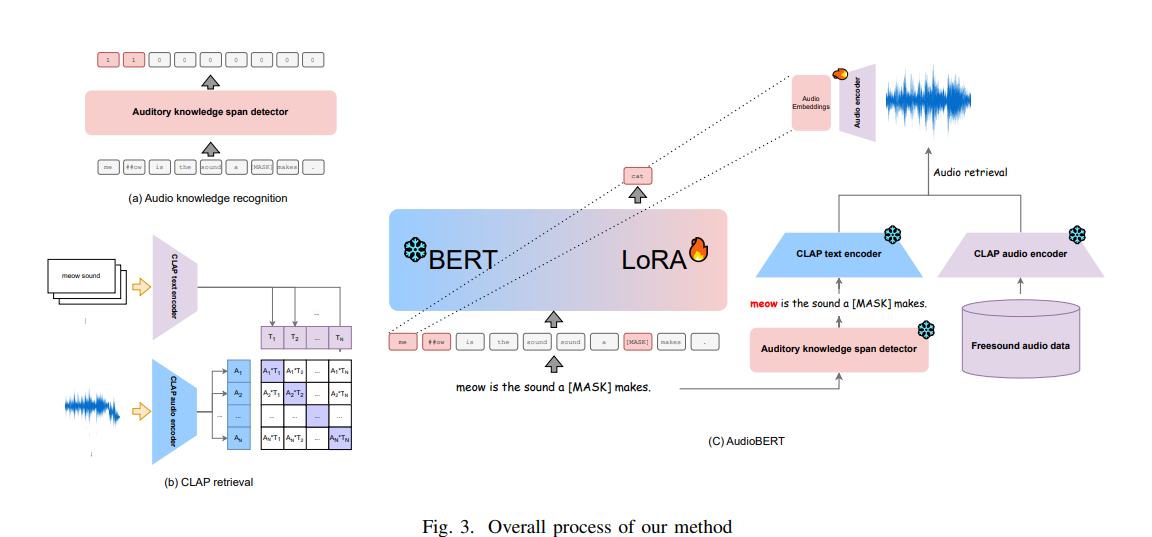 예를 들어, 일상적인 소리(동물 울음소리, 음조 등)에 대한 이해가 제한적입니다. 이러한 문제를 해결하기 위해 AudioBERT는 BERT 기반의 언어 모델에 오디오 지식을 주입하여 Text와 Audio 간의 상호작용을 학습하도록 설계되었습니다.