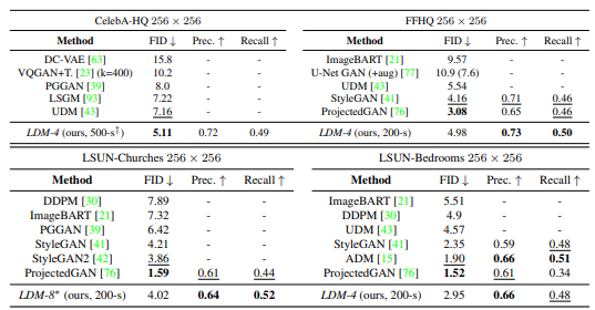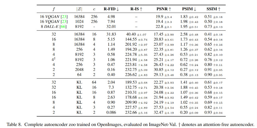 위의 표는 이 섹션에서 비교한 LDM에 사용된 first stage model의 hyper-parameter 및 재구성 성능을 보여줍니다.
