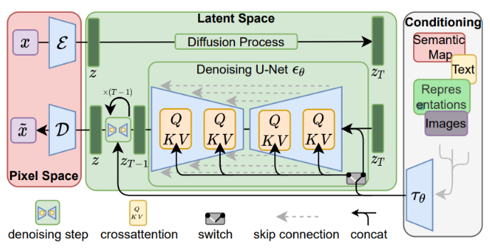 마지막으로 Conditioning Mechanisms을 알아보겠습니다. Stable Diffusion 이전의 Diffusion 모델들에는 다양한 Conditioning 과의 결합에 대한 연구가 없었다고 합니다. Stable Diffusion은 cross-attention을 사용하여 다양한 조건을 사용할 수 있게끔 만들었습니다. Conditioning이란 텍스트나 이미지 등의 추가적인 표현을 의미한다고 볼 수 있습니다. 예로, 텍스트가 조건으로 들어갈 경우가 요즘 자주 보이는 text-to-image 모델입니다.