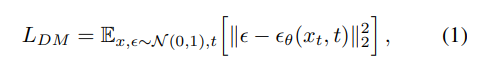 이는 해당 목적함수입니다. 여기서 은 Gaussian noise, 는 noise 예측 네트워크입니다. 는 Input x의 noise가 추가된 버전입니다.