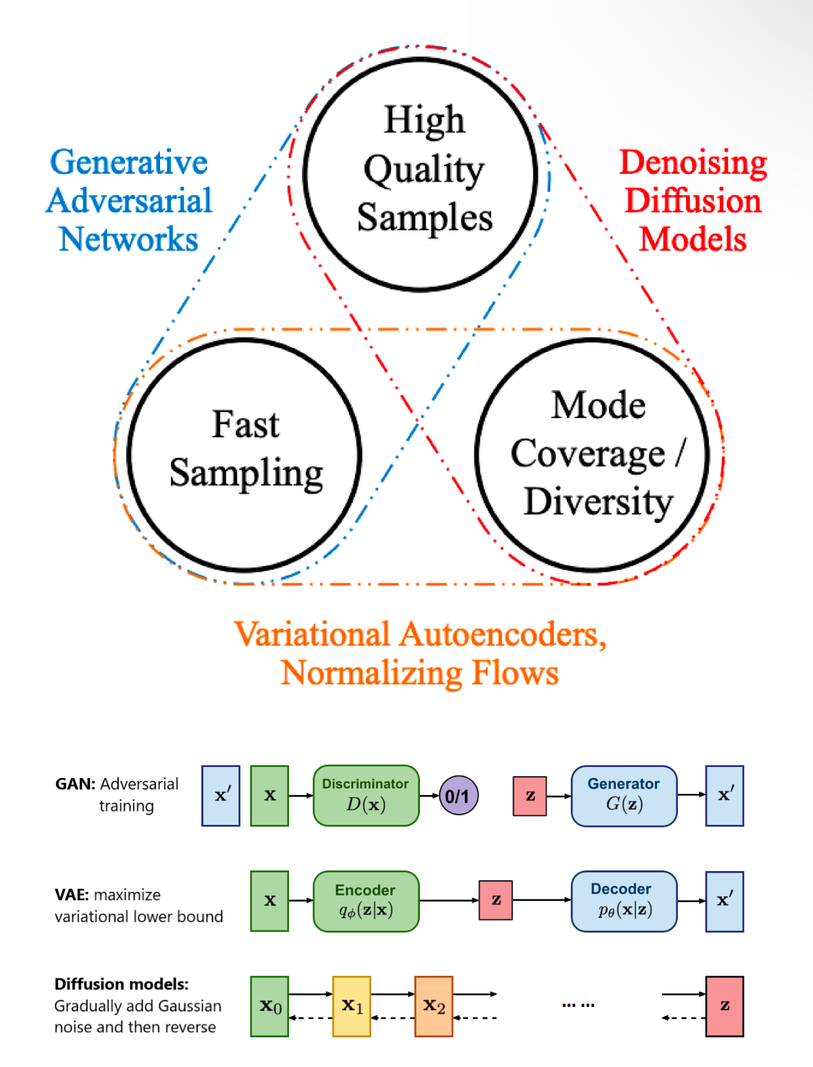 논문에서는 Diffusion 모델을 설명하기에 앞서 이전까지 생성 모델 Task에서 인기있었던 GAN 모델에 대해 먼저 이야기합니다. 특히 GAN 모델이 가지고 있던 문제점에 대해 이야기 하며 Diffusion 기반의 모델이기에 기존에 GAN 모델이 가지고 있던 Mode Collapse나 Training instability와 같은 문제가 발생하지 않는다는 점을 이야기합니다.