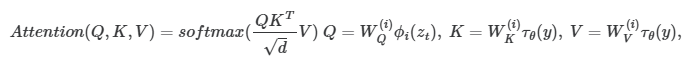 여기서의 크로스 어텐션 매커니즘은 Query는 기존 의 값을, Key와 Value는 의 값을 가져오는 전형적인 방법입니다. 즉 식으로 표현하면 다음과 같이 표현할 수 있습니다.